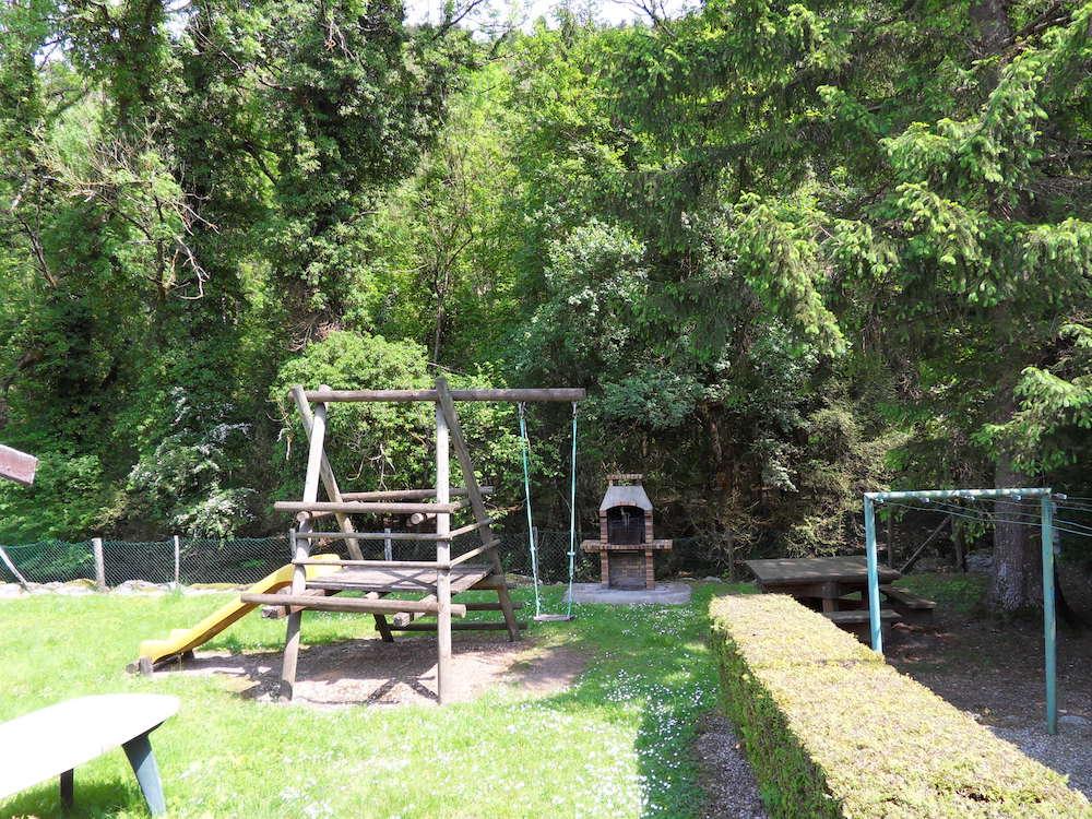 • Jardin commun en bord de rivière avec table de pique-nique barbecue et balançoire